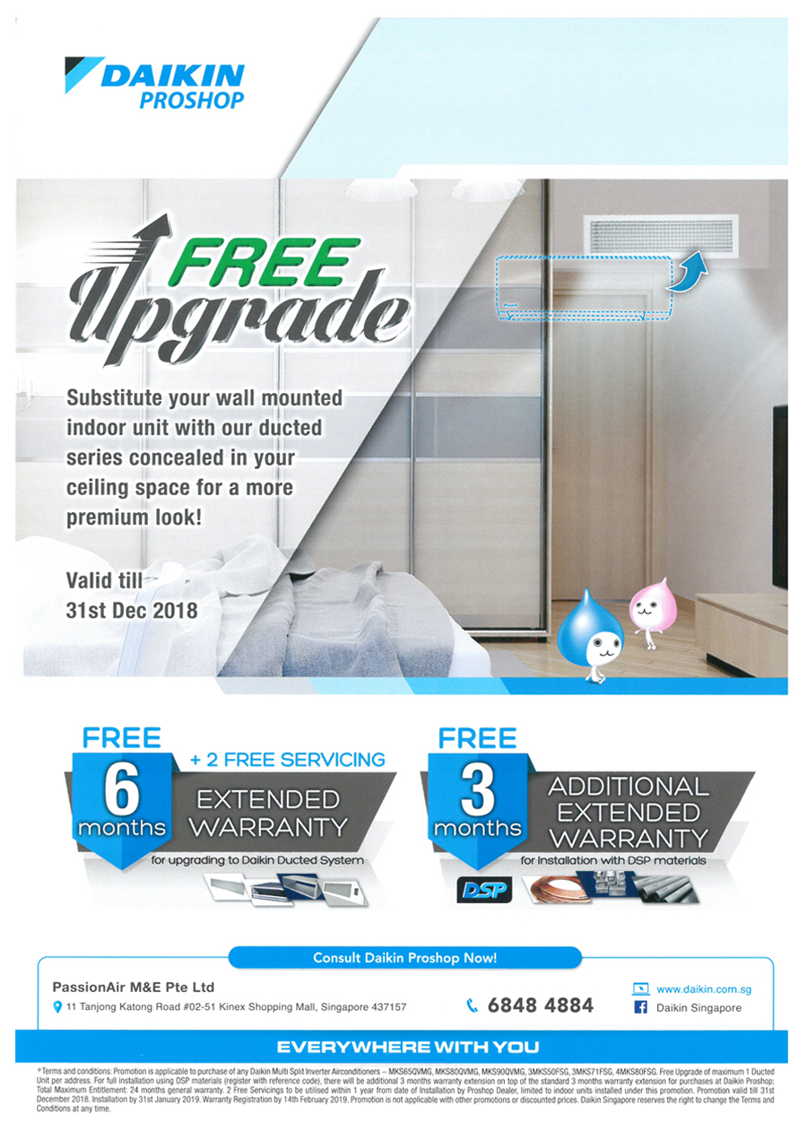 We provide serveral type of promotions occationally. Kindly check the following: Daikin CleAir Air Purifier (MC30VVMH) Promotion Daikin E-Proshop Exclusive Promotion 2021 Lunar New Year Aircon Sale 50-Year Anniversary Daikin Aircon Promotion Daikin Aircon Promotion Daikin Aircon Promotion